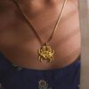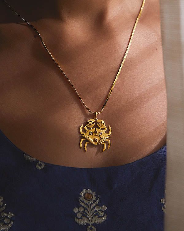 Bringing you luck in many adventures, the Cancerian crab gold-plated/handcrafted in brass pendant necklace by Fizzy Gs is detailed with pink ruby zirconia for comfort.